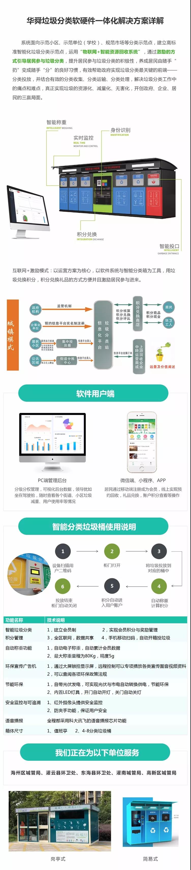 经过一年多的研究整合,华舜网络推出了一套针对垃圾分类的软硬件一体化解决方案,旨在运用“物联网+智能资源回收系统”,通过激励方式引导居民参与垃圾分类,提升积极性。